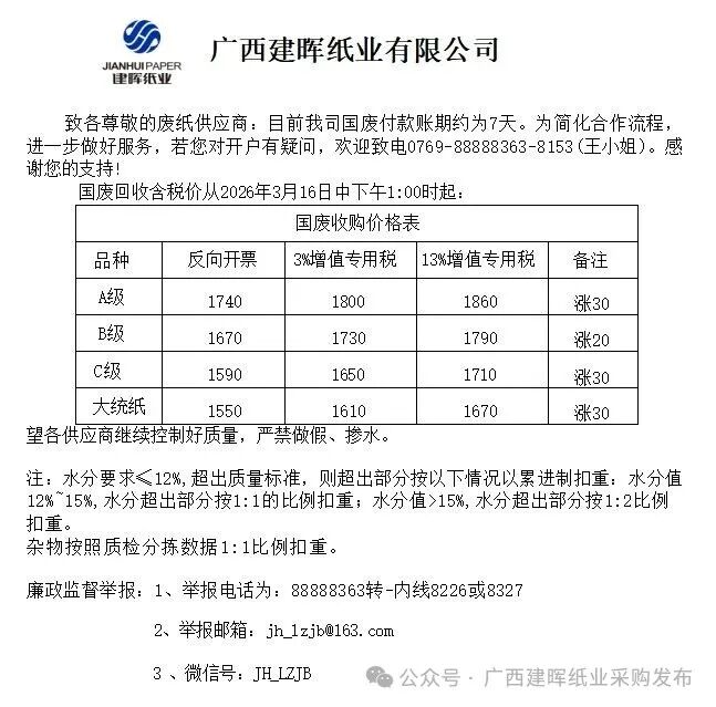广西建晖国废报价2026年3月16日中午1:00时起